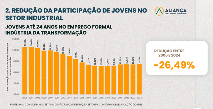Os dados mostram também que a participação de jovens no setor industrial vem caindo. “Nós temos discutido muito no Senai o que pode ser feito para atrair os jovens para a indústria, para a área produtiva. A meninada só pensa em TI, não quer colocar a mão na graxa, no serviço pesado. Nós tivemos uma redução, de 2006 a 2024, de 26,49% na indústria de transformação – que não pega a parte automotiva”, disse o palestrante.