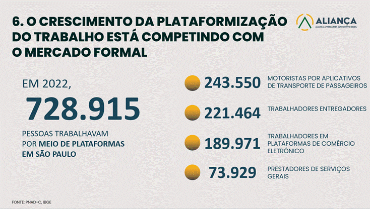 Em 2022, eram mais de 728 mil pessoas realizando serviços por meio de plataformas no estado de São Paulo, sendo 243,5 mil motoristas de aplicativos. “Há uns dois anos um motoboy bateu no meu carro e quebrou a perna. Ia ficar 90 dias sem poder trabalhar. Eu quis dar um jeito de ajudar aquele rapaz e pedi pra ele enviar para nossa corretora os ganhos que ele obtinha fazendo entregas. Ele tirava de 200 a 300 reais por dia fazendo entrega de alimentos com motocicleta. Ou seja, ele ganha mais do que a gente paga para o funcionário registrado em nossas empresas. Claro, não tem décimo-terceiro, fundo de garantia ou férias. Mas acaba colocando mais dinheiro no bolso. Infelizmente isso é um problema bastante sério”, contou José Arnaldo Laguna.