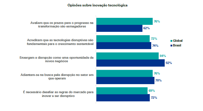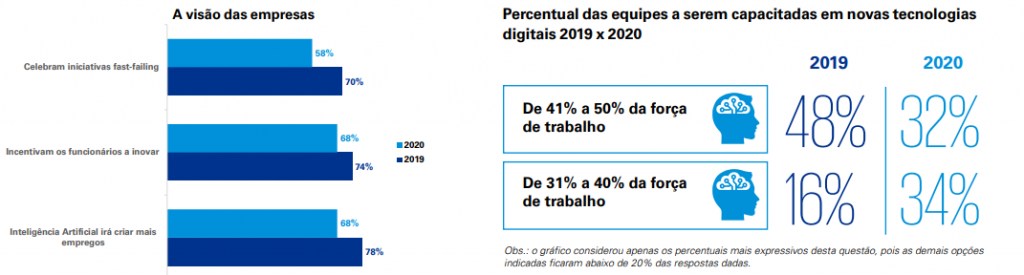 Na pesquisa CEO Outlook Brasil 2020, a KPMG buscou mensurar os impactos das inovações tecnológicas na manutenção ou geração dos empregos. O estudo concluiu que, embora se mantenham com percentuais bastante altos em 2020, houve uma queda geral no número de lideranças que têm visão mais focada no incentivo aos colaboradores no que se refere à inovação. “Sobressai nessa análise a queda de dez pontos percentuais no número de entrevistados que aposta que os recursos como inteligência artificial e robótica criarão mais empregos”, diz o relatório.