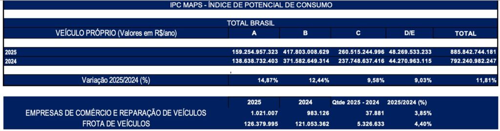 O setor automotivo brasileiro movimentará mais de R$ 885,8 bilhões até o final de 2025, ou seja, 11,8% a mais que os R$ 792,2 bilhões que circularam ao longo do ano passado. Tal cenário indica que as despesas com veículo próprio chegam a comprometer 11,7% do orçamento familiar. Os dados são da Pesquisa IPC Maps, especializada em potencial de consumo nacional há mais de 30 anos, com base em fontes oficiais.