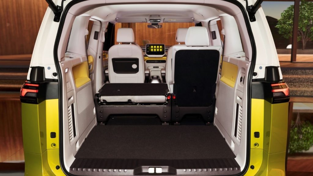Os ocupantes do ID. Buzz têm um ambiente digno de uma sala de estar: cinco pessoas dispõem de amplo espaço para viajar e para levar suas bagagens (com até 1.121 litros de capacidade). Se a segunda fileira de bancos for rebatida, a capacidade de carga sobe para até 2.205 litros. Configurações com seis e sete lugares e distância entre eixos maior virão em médio prazo. Enquanto isso, três bancos na dianteira (alternativamente dois) e uma divisória fixa separando o espaço de carga são itens diferenciados da configuração do ID. Buzz Cargo. A van com emissão zero pode levar dois pallets de tamanho padrão na parte traseira.